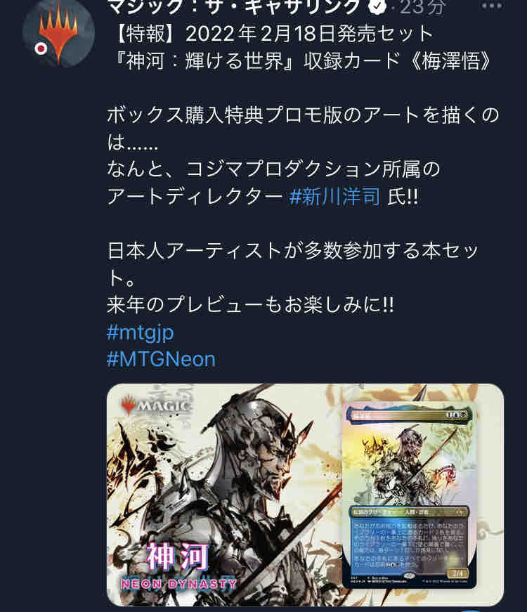 2021年12月25日 【ネオ神河】大物日本人アーティスト2人目発表 原哲夫に続き、2人目の大物日本人アーティストが発表されました。メタルギアシリーズのイラストでお馴染みの新川洋司さんでした。ボックス購入特典なので入手はしやすいです。サインやアーティストプルーフのコレクター的にはシンドイですね。。 スポンサードリンク 「ネオ神河」カテゴリの最新記事 < 前の記事次の記事 > コメント コメント一覧 (2) 1. 名無しプレインズウォーカー 2021年12月26日 08:47 コレクター需要やばそうですね・・・私も1枚欲しい・・・ このセットはめちゃくちゃ人気でそうでね 0 teamhirahira がしました 2. 平平 2021年12月28日 21:19 >>1 流石に私もボックスを久し振りに買おうかなという気になってきました。みんなで夢を見てみんなで爆死しましょう。 0 teamhirahira がしました コメントフォーム 名前 コメント 記事の評価 リセット リセット 顔 星 情報を記憶 コメントを投稿する