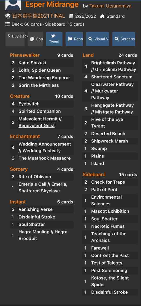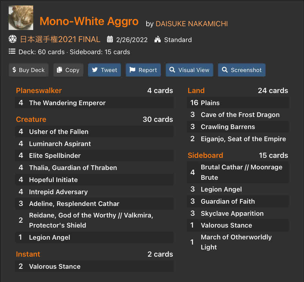 2月26日に日本選手権2021FINALが開催され、白単アグロが優勝しました。